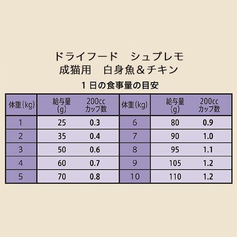 | 保証成分 | 【シュプレモ】 タンパク質:35.0%以上、脂質:14.0%以上、粗繊維:4.0%以下、灰分:9.6%以下、水分:8.0%以下、[その他含有成分]オメガ3脂肪酸:0.50%以上、オメガ6脂肪酸:3.00%以上、マグネシウム:0.14%(標準) 【ナチュラルチョイス】 タンパク質:33.0%以上、脂質:14.0%以上、粗繊維:7.0%以下、灰分:10.0%以下、水分:10.0%以下 オメガ3脂肪酸:0.3%以上、オメガ6脂肪酸:3.5%以上、ビタミンE:250IU/kg以上、タウリン:0.18%以上、カルシウム:0.9%以上、マグネシウム(標準):0.12% 【とろけるツナ&白身魚】 タンパク質:8.0%以上、脂質:0.5%以上、粗繊維:0.5%以下、灰分:1.5%以下、水分:88.0%以下 |