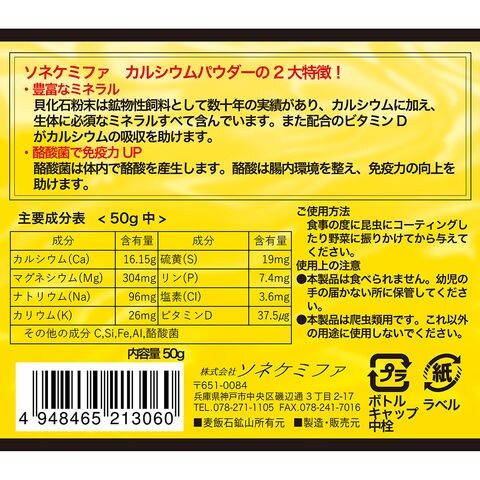 ソネケミファ カルシウムパウダー 50g 爬虫類 貝化石粉末 酪酸菌 関東当日便