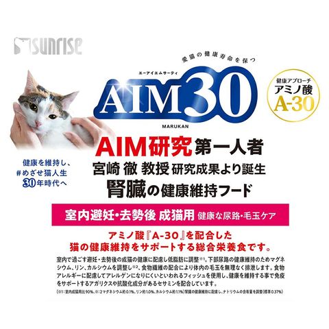 AIMhfis キャットフード サンライズ AIM30 室内避妊・去勢後成猫用 健康な尿路・毛玉ケア フィッシュ 1.2kg 食事 ご飯 ごはん 餌 えさ 猫フード 猫 ねこ 成猫 ねこのご飯 健康 健康維持 健康寿命 小分け 国産 国内産 日本産 日本製 ネコ用 猫用 腎臓 室内 魚 魚味 アミノ酸 総合栄養食 毛玉 尿路 下部尿路 乳酸菌 食物繊維 免疫 免疫力 皮膚被毛 セサミン ドライフード 室内避妊 避妊 去勢 去勢後 4973321943683 エイム AIM フード かりかり 室内猫 避妊後 ngwordCHK_OK ドライ 20260117 y26m01 kak まとめ売り まとめ 複数売り