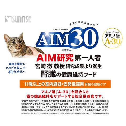 AIM11hchi キャットフード サンライズ AIM30 11歳以上の室内避妊・去勢後猫用 腎臓の健康ケア 1.2kg 食事 ご飯 ごはん 餌 えさ 猫フード 猫 ねこ シニア猫 老猫 ねこのご飯 健康 健康維持 健康寿命 小分け 国産 国内産 日本産 日本製 ネコ用 猫用 腎臓 室内避妊 避妊 去勢 去勢後 ちきん チキン味 アミノ酸 総合栄養食 11歳以上 11歳 毛玉 乳酸菌 低脂肪 食物繊維 免疫 免疫力 皮膚被毛 セサミン ドライフード エイム AIM フード かりかり 室内猫 避妊後 高齢猫 4973321943652 ngwordCHK_OK ドライ 20260117 y26m01 kak まとめ売り まとめ 複数売り