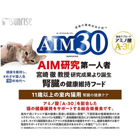 AIM11chi キャットフード サンライズ AIM30 11歳以上の室内猫用 腎臓の健康ケア 1.2kg 食事 ご飯 ごはん 餌 えさ 猫フード 猫 ねこ シニア猫 老猫 ねこのご飯 健康 健康維持 健康寿命 小分け 国産 国内産 日本産 日本製 ネコ用 猫用 腎臓 じんぞう 室内避妊 ちきん チキン味 アミノ酸 総合栄養食 11歳以上 11歳 毛玉 乳酸菌 低脂肪 食物繊維 免疫 免疫力 皮膚被毛 セサミン ドライフード エイム AIM フード かりかり 室内猫 高齢猫 4973321943645 ngwordCHK_OK ドライ 20260117 y26m01 kak まとめ売り まとめ 複数売り