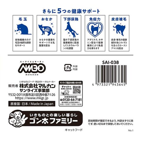 原材料 トウモロコシ、グルテンミール、チキン、ビーフ、ポーク、動物性油脂、小麦粉、フィッシュエキス、ローストアマニ、食物繊維、植物性油脂、酵母、チキンレバーパウダー、おからパウダー、まぐろ・かつお削りぶしパウダー、乳酸菌、アガリクス、クランベリー、セサミン、ミネラル類(P、Na、CI、Ca、K、Zn、Fe、Cu、Co、Mn、I)、アミノ酸類(シスチン、メチオニン、タウリン)、ビタミン類(A、B1、B2、B6、B12、C、D3、E、K3、コリン、ニコチン酸、パントテン酸、ビオチン、葉酸)、調味料、酸化防止剤(ミックストコフェロール、ハーブ抽出物)