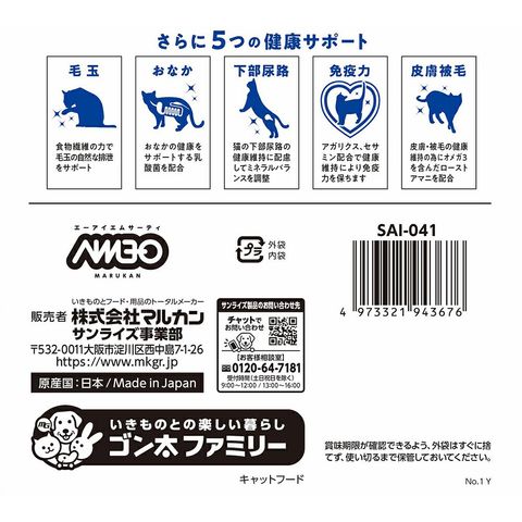 | 特長 | ●アミノ酸A-30を配合した成猫の健康維持をサポートする総合栄養食です。 ●食物アレルギーに配慮して、アレルゲンになりにくいといわれるフィッシュを使用しています。 ●下部尿路、皮膚被毛の健康維持のため、マグネシウム、リン、カルシウム、オメガ3脂肪酸を含んだローストアマニを配合しました。 ●食物繊維の力で体内の毛玉を無理なく排泄します。 ●免疫力維持をサポートするアガリクスや、抗菌化成分があるセサミンを含んでいます。 |