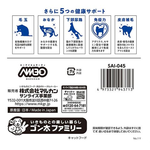 | 原材料 | トウモロコシ、グルテンミール、フィッシュミール、小麦粉、乾燥おから、動物性油脂、フィッシュエキス、ローストアマニ、食物繊維、酵母、まぐろ・かつお削りぶしパウダー、乳酸菌、植物性油脂、アガリクス、セサミン、ミネラル類(P、K、CI、Na、Zn、Cu、Mn、I)、アミノ酸類(シスチン、メチオニン、タウリン)、ビタミン類(コリン、E、ニコチン酸、C、B1、B2、A、B6、葉酸、パントテン酸、K、B12、D3)、調味料 |