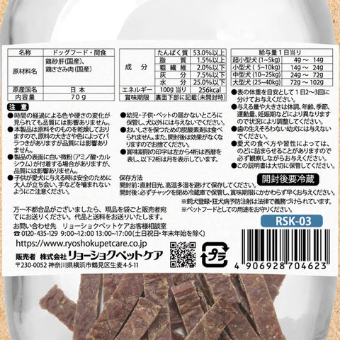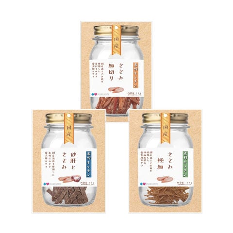 【ささみ細切り】 ●国産鶏ささみ肉を使用した犬用ジャーキーです。 ●しつけやご褒美など、愛犬とのコミュニケーションの際におやつとしてお与えください。 ●細切りなので、お口の小さい愛犬にも与えやすいです。 【ささみ極細】 ●国産鶏ささみ肉を使用した犬用ジャーキーです。 ●しつけやご褒美など、愛犬とのコミュニケーションの際におやつとしてお与えください。 ●極細なので、硬いジャーキーが苦手な愛犬にも与えやすいです。 【砂肝とささみ】 ●国産鶏ささみ肉と砂肝を使用した犬用ジャーキーです。 ●しつけやご褒美など、愛犬とのコミュニケーションの際におやつとしてお与えください。 ●薄くスライスされているので、硬いジャーキーが苦手なペットでもガジガジ噛めます。 |