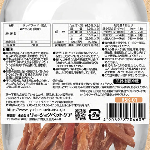 【ささみ細切り】 粗タンパク質:61.0%以上、 脂質:1.0%以上、 粗繊維:1.5%以下、灰分:6.5%以下、水分:25.0%以下 【ささみ極細】 粗タンパク質:61.0%以上、 脂質:1.0%以上、 粗繊維:1.5%以下、灰分:7.0%以下、水分:25.0%以下 【砂肝とささみ】 粗タンパク質:53.0%以上、 脂質:1.5%以上、 粗繊維:2.0%以下、灰分:7.5%以下、水分:25.0%以下 |
