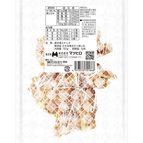 frditem_hidden マツヒロ 素材万歳 無添加 ささみ巻きさつまいも 50g 4573533701868 20260202 y26m02 cngc ドッグフード 犬フード 犬おやつ 間食 スナック 犬用 いぬ用 いぬ dog 薩摩芋 サツマイモ さつま芋 鶏肉 鶏 鶏ささみ チキン 厳選素材 厳選 国産 日本産 日本 硬め かため