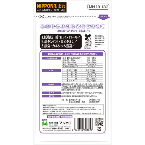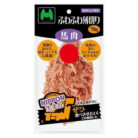 frditem_hidden マツヒロ NIPPON生まれ ふわふわ薄切り馬肉 70g 4560354301827 20260202 y26m02 cngc ドッグフード 犬フード 犬おやつ 間食 スナック 犬用 いぬ用 いぬ dog ふわふわ 薄切り 薄削り スライス やわらかい 柔らかい 食べやすい 馬肉 馬 鶏肉 鶏 幼犬 シニア犬 老犬 高齢 高齢犬 食欲不振 食欲ない 夏バテ ふりかけ 国産 日本産 日本 タンパク質 高タンパク 高ビタミン ビタミン 低脂肪 低コレステロール コレステロール 鉄分 カルシウム グリコーゲン 免疫力 良質 混ぜる