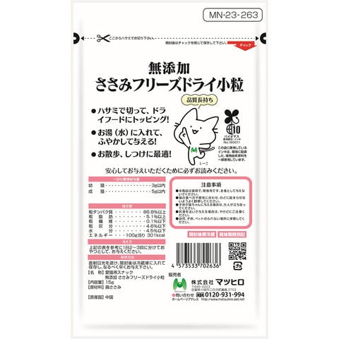 frditem_hidden マツヒロ 無添加 ささみフリーズドライ 小粒 15g 4573533702636 20260209 y26m02 cngc キャット キャットフード 猫フード 猫おやつ おやつ 間食 スナック 猫用 ねこ用 ねこ cat 鶏肉 鶏 鶏ささみ チキン フリーズドライ 品質長持ち 長持ち トッピング お湯 湯 水 みず ふやかす お散歩 散歩 さんぽ しつけ 栄養そのまま 品質そのまま