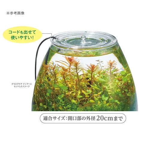 【グラスアクア シリンダー N】 ●アクアリウム、テラリウムなどいろいろな使い方で楽しめる水槽です。 ●クセの無いシンプルな円柱状で、開口部が広いからレイアウトしやすいです。 【グラストップラウンド グラスアクアリウム用フタ】 ●グラスアクアや金魚鉢等の円形水槽の開口部に乗せて、水の蒸発を抑え、魚の飛び出しを防止するプラスチックフタです。 ●湿度が維持でき、コケの育成やテラリウムにも最適です。 ●お持ちの水槽サイズに合わせて切り取って使用できます。 ●光を通すクリアタイプです。 ●メンテナンスしやすい取っ手付きです。 |