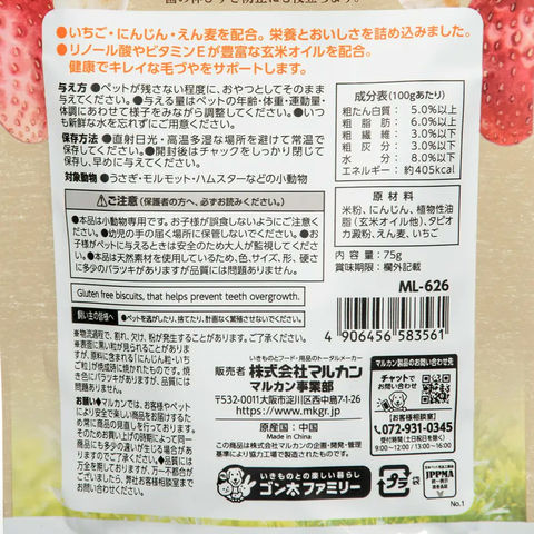 ●小麦、糖類を一切使用せず、おいしく丁寧に焼き上げた小動物用のおやつです。 ●サクサク食感のビスケットをかじることで、歯の伸びすぎ防止にも役立ちます。 ●保存に便利なチャック付きです。 |