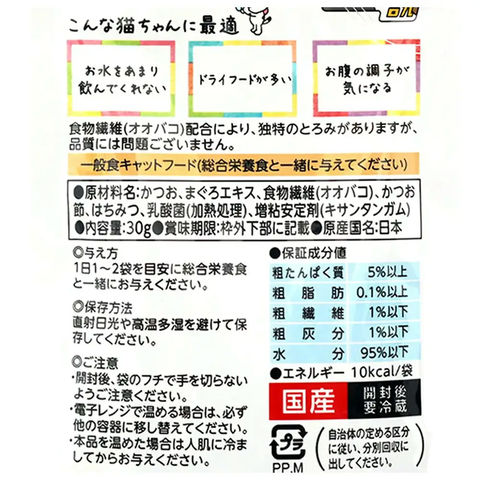 【まぐろ】 まぐろ、まぐろエキス、食物繊維(オオバコ)、かつお節、はちみつ、乳酸菌(加熱処理)、増粘安定剤(キサンタンガム) 【かつお】 かつお、まぐろエキス、食物繊維(オオバコ)、かつお節、はちみつ、乳酸菌(加熱処理)、増粘安定剤(キサンタンガム) |