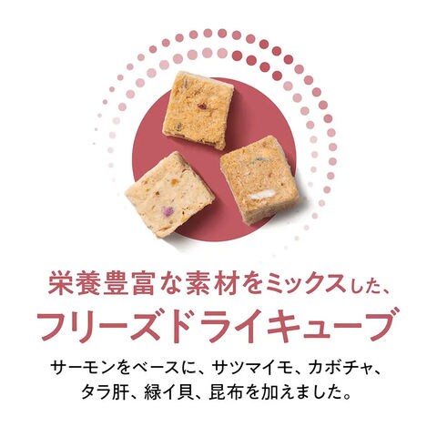 特長 ●高タンパクで歯ごたえのあるキブルに、フリーズドライの素材そのままのおいしさを加えたのドライフードです。