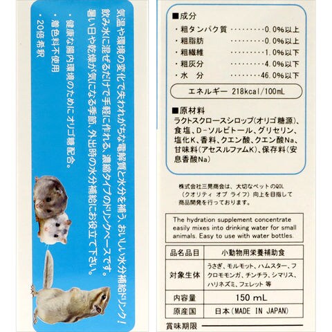 | ご注意 | ※本品は小動物の水分補給用ドリンクの濃縮液です。目的用途以外に使用しないでください。 ※本品の原液を直接与えないでください。 |