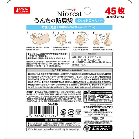 メーカー画像 マルカン ニオレスト うんちの防臭袋ポケットロールセット 45枚 15枚×3ロール 4906456585947 DA-599 Niorest 犬 いぬ ドッグ DOG 愛犬 イヌ用 犬用 犬用品 いぬ用品 用品 トイレ用品 散歩用品 マナー袋 うんち袋 うんち 糞 フン 排泄物 臭い ニオイ 驚異の防臭 防臭 消臭 お散歩 携帯用 持ち運び 便利 かさばらない 骨型ケース ロールタイプ 中身が見えにくい 不透明袋 特殊フィルム 20260210 y26m02 ngtk