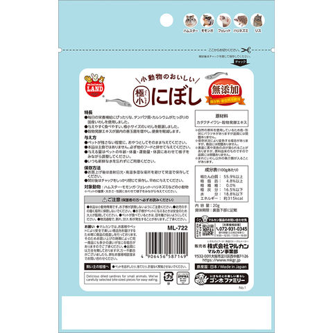 y26m03 ミニマルランド 小動物のおいしい 極小にぼし 20g 無添加 国産 栄養補給 ハムスター モモンガ フェレット ハリネズミ リス ML-722 小動物 おやつ にぼし ハムスター リス タンパク質 カルシウム DHA EPA 小動物用おやつ フード エサ 餌 飼料 小魚 魚 フィッシュ Fish 20260211 y26m02 kak 4906456587149 マルカン 雑食 雑食系