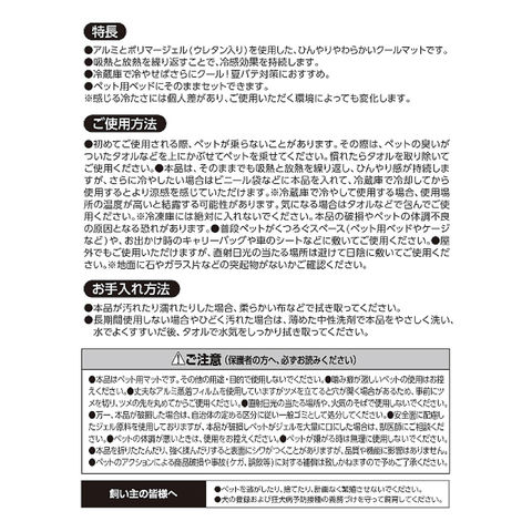 ※本品はペット用マットです。その他の用途・目的で使用しないでください。 ※噛み癖が激しいペットの使用はお控えください。 ※丈夫なアルミ蒸着フィルムを使用していますがツメを立てると穴が開く場合があるため、事前にツメを切り、ツメの先を丸めてからご使用ください。 ※直射日光の当たる場所や、火気のそばで使用しないでください。 ※万一、本品が破損した場合は、自治体の定める区分に従い一般ゴミとして処分してください。 ※安全面に配慮したジェル原料を使用しておりますが、本品が破損しペットがジェルを大量に口にした場合は、獣医師にご相談ください。 ※ペットの体調が悪いときは、使用をお控えください。 ※ペットが嫌がる時は無理に使用しないでください。 ※本品を折りたたんだり、強く揉んだりすると表面にシワがつくことがありますが、品質や機能に影響はありません。 ※ペットのアクションによる商品破損や事故(ケガ、誤飲等)に対する補償は致しかねますので予めご了承ください。 |