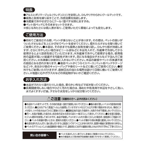 ※本品はペット用マットです。その他の用途・目的で使用しないでください。 ※噛み癖が激しいペットの使用はお控えください。 ※丈夫なアルミ蒸着フィルムを使用していますがツメを立てると穴が開く場合があるため、事前にツメを切り、ツメの先を丸めてからご使用ください。 ※直射日光の当たる場所や、火気のそばで使用しないでください。 ※万一、本品が破損した場合は、自治体の定める区分に従い一般ゴミとして処分してください。 ※安全面に配慮したジェル原料を使用しておりますが、本品が破損しペットがジェルを大量に口にした場合は、獣医師にご相談ください。 ※ペットの体調が悪いときは、使用をお控えください。 ※ペットが嫌がる時は無理に使用しないでください。 ※本品を折りたたんだり、強く揉んだりすると表面にシワがつくことがありますが、品質や機能に影響はありません。 ※ペットのアクションによる商品破損や事故(ケガ、誤飲等)に対する補償は致しかねますので予めご了承ください。 |