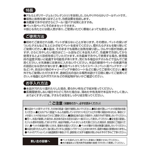 ※本品はペット用マットです。その他の用途・目的で使用しないでください。 ※噛み癖が激しいペットの使用はお控えください。 ※丈夫なアルミ蒸着フィルムを使用していますがツメを立てると穴が開く場合があるため、事前にツメを切り、ツメの先を丸めてからご使用ください。 ※直射日光の当たる場所や、火気のそばで使用しないでください。 ※万一、本品が破損した場合は、自治体の定める区分に従い一般ゴミとして処分してください。 ※安全面に配慮したジェル原料を使用しておりますが、本品が破損しペットがジェルを大量に口にした場合は、獣医師にご相談ください。 ※ペットの体調が悪いときは、使用をお控えください。 ※ペットが嫌がる時は無理に使用しないでください。 ※本品を折りたたんだり、強く揉んだりすると表面にシワがつくことがありますが、品質や機能に影響はありません。 ※ペットのアクションによる商品破損や事故(ケガ、誤飲等)に対する補償は致しかねますので予めご了承ください。 |