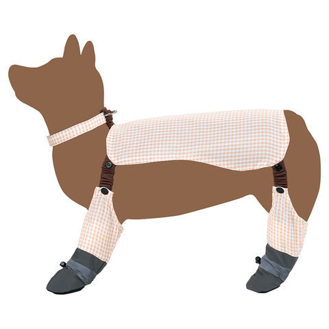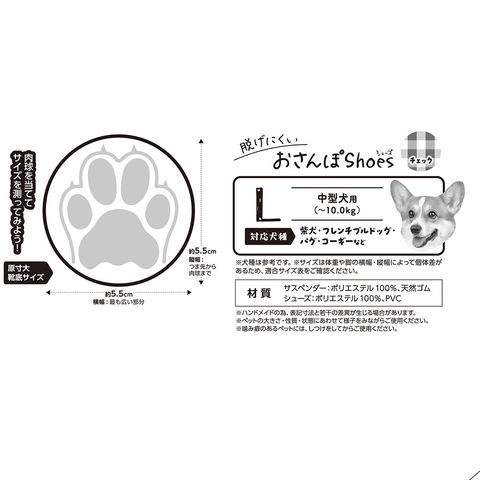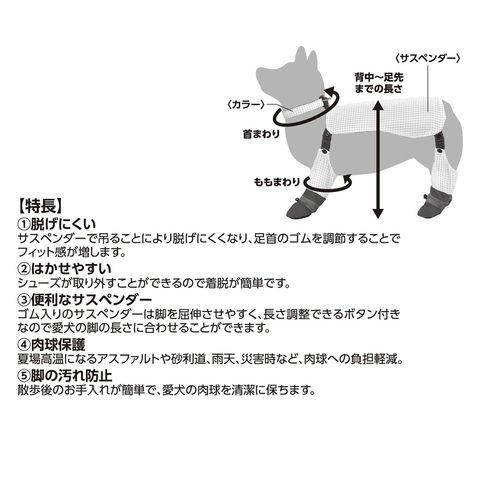 | 特長 | ●落ち着いた色合いのチェックデザインが特徴の犬用シューズです。 ●首まわりに繋げるカラー(首輪)一体型のサスペンダーを採用し、動いてもシューズが脱げにくく、しっかりと足元を固定します。 ●夏場の熱いアスファルトや冬の冷たい地面から肉球を守ります。また、雨上がりのお散歩でも脚が汚れず、室内を清潔に保てます。 ●サスペンダーには3段階の調節ボタンが付いており、愛犬の体型や足の長さに合わせてぴったりの長さに調整可能です。 ●シューズの底面には滑り止め加工が施されています。フローリングや滑りやすい路面でも安定した歩行をサポートします。 |