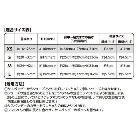 | ご注意 | ※本品はペット用のシューズです。その他の目的には使用しないでください。 ※ペットの爪を切ってからご使用ください。穴あきや破損の原因となります。 |