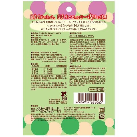 frditem_hidden メーカー画像 ペッツルート さつまいもとブロッコリーのガム 70g 4984937685065 20260309 y26m03 cngc 犬 イヌ いぬ dog DOG 犬おやつ おやつ dogfood ドッグフード ドックフード 間食 スナック さつまいも サツマイモ 薩摩芋 ブロッコリー ガム 野菜 野菜ガム 国産 日本 日本産 自然な甘み 噛む 噛める ほどよい弾力 子犬 幼犬 シニア シニア犬 老犬 高齢犬 食物繊維 ビタミンC βカロテン 健康 腸内環境 腸内 超小型犬 小型犬 中型犬