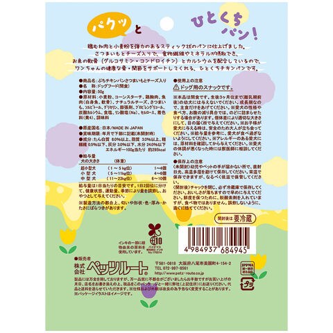 メーカー画像 ペッツルート ぷちチキンパン さつまいもとチーズ入り 50g 4984937684945 20260309 y26m03 cngc 犬 イヌ いぬ dog DOG 犬おやつ おやつ dogfood ドッグフード ドックフード 間食 スナック トリーツ パン ひとくちパン 一口 チキンパン 小麦粉 さつまいも サツマイモ 薩摩芋 チキン 鶏 鶏胸肉 鶏むね肉 鶏肉 チーズ 国産 日本 日本産 スティック 食物繊維 ミネラル お魚 魚 白身魚 軟骨 グルコサミン コンドロイチン カルシウム 健康な骨 関節 サポート 弾力 プチ ぷち 超小型犬 小型犬 中型犬