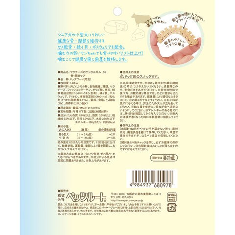 メーカー画像 ペッツルート ヤクチーズのデンタルガム SS 骨・関節ケア 14本入 4984937680978 20260310 y26m03 cngc 犬 イヌ いぬ dog DOG 犬おやつ dogfood ドッグフード ドックフード 間食 スナック トリーツ ヤクチーズ チーズ 濃厚 デンタル デンタルガム デンタルケア ガム 歯 歯茎 ブラッシング形状 特殊ブロック 国産 日本 日本産 弾力 ソフト 超小型犬 小型犬 噛む サメ軟骨 緑イ貝 ボスウェリア 骨ケア 骨 関節ケア 関節 シニア犬 老犬 高齢犬 食べやすい 健康維持 分包 melma2604dgmail