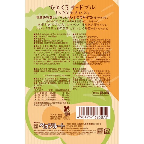 ペッツルート 素材メモ ひとくちオードブル ミックスやさい入り 60g 犬 おやつ 4984937685072 犬フード ドッグフード ドックフード dog dogfood いぬ お菓子 スナック ご褒美 褒美 ごほうび 間食 フード エサ 餌 ジャーキー お肉 肉 一口 キューブ キューブ状 野菜 やさい ささみ 鶏 鶏肉 鶏ささみ しつけ スナック 20260412 kak y26m04 小型犬 超小型犬 シニア犬 シニア 高齢 高齢犬 柔らかい やわらかい やらかい やわめ 国産 frditem_hidden