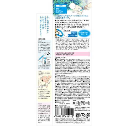 メーカー画像 ペッツルート やさしい爪のバリア 犬用 3.5ml(約80回分) 4984937654115 20260403 y26m04 cngc 犬 いぬ イヌ 犬用 犬用品 お手入れ ケア ケア用品 ドッグ dog 爪ケア 爪 つめ ツメ 爪バリア 保護ネイル 爪に優しい 水性ネイル ネイル 仔犬期 子犬 仔犬 幼犬 オールステージ 国産 日本 日本産 日本製 ヒアルロン酸 ケラチン 潤う 保護コート 有機溶剤不使用 合成着色料不使用 香料不使用