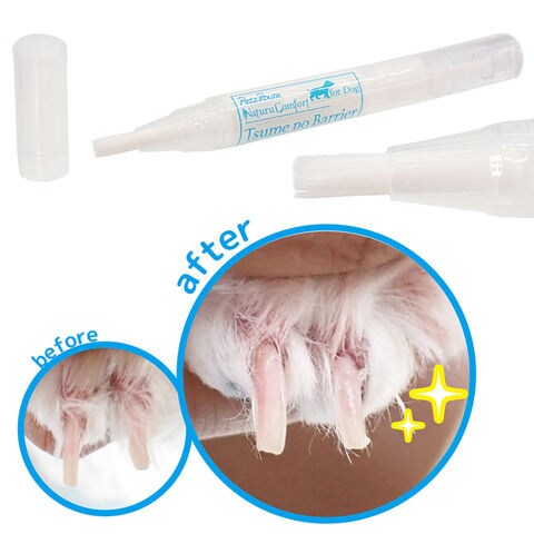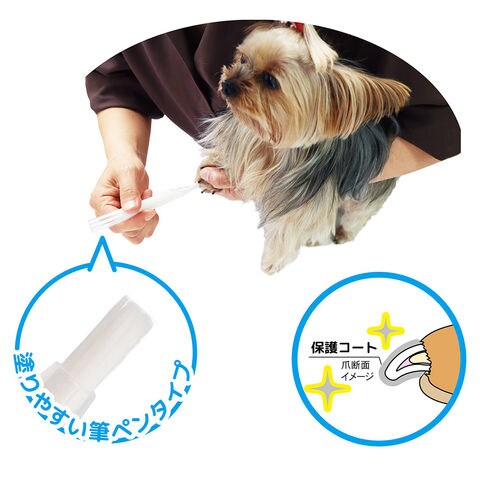 | 使用方法 | Step.1)初めて使う際は、キャップを外し毛先を横にして、先に中身が出てくるのを確認しながら数回まわし、毛先に溶液が染みてきたら塗ってください。 ※回しすぎると毛先から液がこぼれることがあります。ご注意ください。 Step.2)足を固定し、爪全体に塗ります。約20秒で乾きます。 ※足の毛についた場合はティッシュでふき取ってください。 ※ドライヤーの送風で乾きが短縮できます。 Step.3)自然に剥がれますので、2~3日に一度の間隔で塗ってください。お散歩で水場に行ったときなどは足を洗った後に再度塗ってください。 ※爪をリセットする場合、ぬるま湯につけてこするか、ぬるま湯で湿らせた布でこすると剥がれます。 |