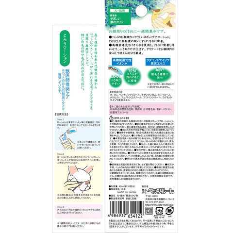 特長 ●ペットのお顔周りにやさしいスポットケアローションで、とろりとした高粘度の潤いしずくが汚れに密着します。