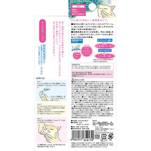 | 特長 | ●猫のお口周り・あごにやさしいスポットケアローションで、気になる黒いつぶつぶ汚れに潤いしずくがさらりと浸透してお肌の状態を整えます。 ●高機能還元性イオン水を使用し、汚れに浸透し浮かせて、ふき取りやすくします。 ●デリケートなお口周りに安心して使える成分を厳選しています。 |