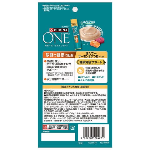 メーカー画像 ピュリナワン おやつ 健康免疫サポート 尿路の健康に配慮 ほたて入りサーモン&かつおペースト 56g 14g×4本 4902201204231 猫 ねこ ネコ キャット cat CAT 猫用 ねこ用 猫フード キャットフード ペットフード 猫餌 猫えさ きゃっとふーど ウェットフード ウェット ウエットフード ウエット レトルト 液状 ペースト おやつ オヤツ 間食 猫用おやつ 猫おやつ 猫オヤツ トリーツ 成猫 成猫用 ホタテ 帆立 鮭 さけ サケ カツオ 鰹 シーフード 魚介 魚 βグルカン ビタミンE オメガ3脂肪酸 免疫 尿路 下部尿路 健康維持 水分補給 なめらか 食べやすい ピュリナ PURINA PURINA_ONE 20260310 y26m03 ngtk cpn2603purina