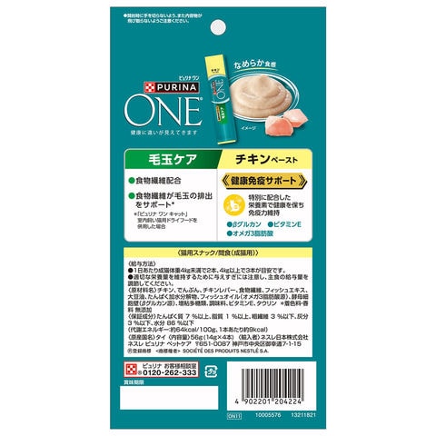 メーカー画像 ピュリナワン おやつ 健康免疫サポート 毛玉ケア チキンペースト 56g 14g×4本 4902201204224 猫 ねこ ネコ キャット cat CAT 猫用 ねこ用 猫フード キャットフード ペットフード 猫餌 猫えさ きゃっとふーど ウェットフード ウェット ウエットフード ウエット レトルト 液状 ペースト おやつ オヤツ 間食 猫用おやつ 猫おやつ 猫オヤツ トリーツ 成猫 成猫用 鶏肉 健康 免疫 毛玉ケア ヘアボール 毛玉 排出 食物繊維 βグルカン ビタミンE オメガ3脂肪酸 なめらか 食べやすい ピュリナ PURINA PURINA_ONE 20260310 y26m03 ngtk cpn2603purina