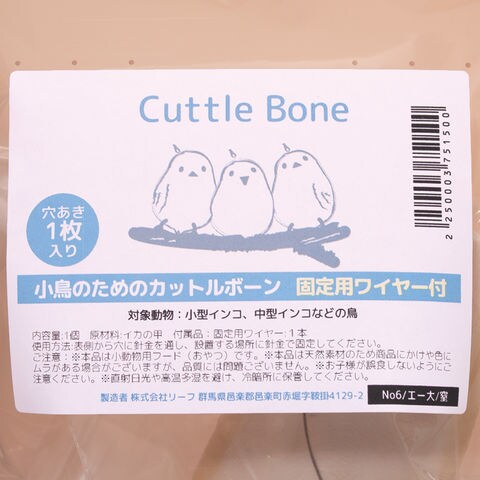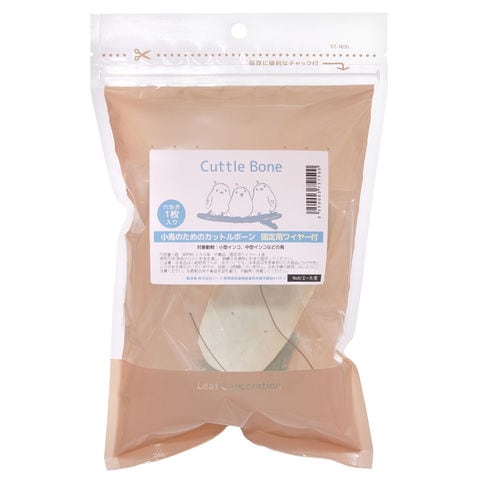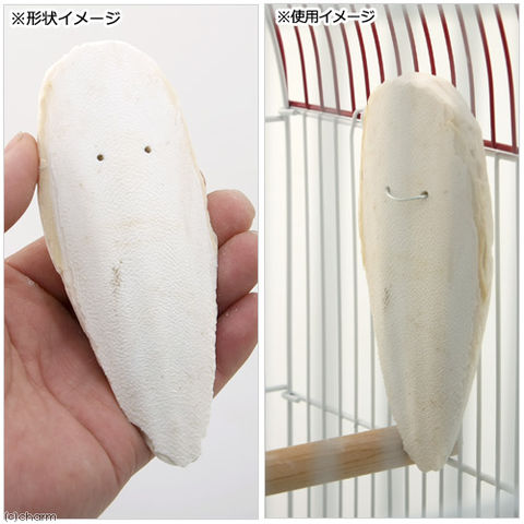 | 特長 | ●小鳥の大好きなカットルボーン(イカの甲)です。 ●穴の開いたカットルボーンに針金つきで設置しやすくなっています。 ●天然のミネラルとカルシウムが豊富で、かじってストレス発散しながら食べられます。 ●着色料や保存料、添加物は使用しておりません。素材そのままなので安心です。 ●保存に便利なチャック付きパッケージです。 |