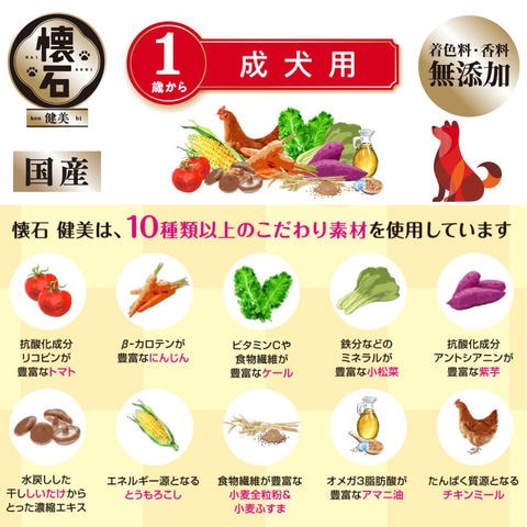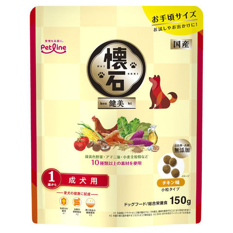 _dog イヌ いぬ 犬 ドッグフード dogfood ドックフード 犬フード フード 餌 えさ エサ ご飯 ごはん ドライフード カリカリ ドライ 懐石 健美 成犬用 1歳から 150g 犬 ドッグフード お試しサイズ 4902418005119 成犬 アダルト 大人 小分け 小分けパック 小粒 チキン 鶏 鶏肉 20260215 kak y26m02 国産 日本産 日本 ペットライン