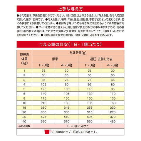 ※本品は1歳以上の成犬用です。対象年齢以外の犬には与えないでください。 ※本品は治療を目的とした療法食ではありません。 ※本品は犬専用です。他の動物には与えないでください。 |