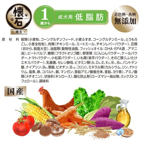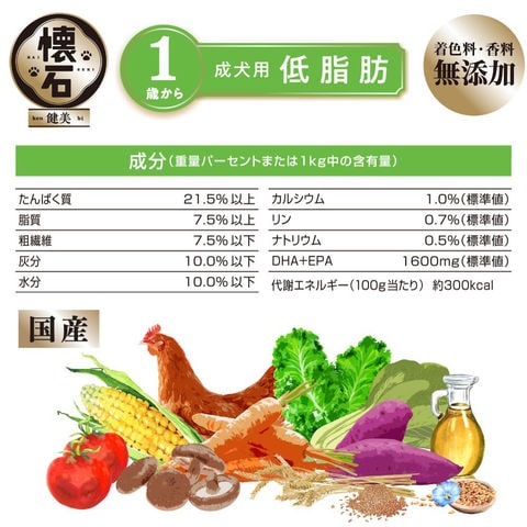 _dog イヌ いぬ 犬 ドッグフード dogfood ドックフード 犬フード フード 餌 えさ エサ ご飯 ごはん ドライフード カリカリ ドライ 懐石 健美 成犬用 低脂肪 1歳から 1kg(250g×4袋) 4902418005157 成犬 アダルト 大人 小分け 小分けパック 小粒 チキン 鶏 鶏肉 20260215 kak y26m02 体重管理 国産 日本産 日本 ペットライン