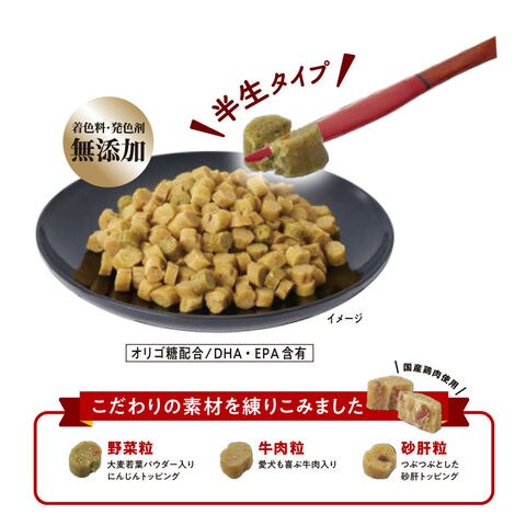 ●国産鶏肉を使用したしっとり食感の半生ごはんです。 ●愛犬の健康に配慮して、機能性原料も配合。 ●使いやすい少量分包で、持ち運びやおやつにもピッタリ。 ●牛肉と砂肝トッピングがそれぞれ練りこまれた「牛肉粒」と「砂肝粒」。 ●オリゴ糖が腸内フローラを整え、健康を維持することにより免疫力をサポートします。 |