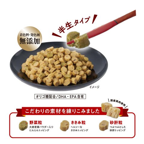| 原材料 | 穀類(小麦粉、小麦グルテン)、肉類(鶏肉、鶏ささみ、砂肝)、豆類(脱脂大豆)、糖類(砂糖、オリゴ糖)、油脂類(動物性油脂、フィッシュオイル:DHA・EPA源、アマニ油)、ビール酵母、野菜類(にんじんパウダー、大麦若葉パウダー)、プロピレングリコール、グリセリン、リン酸塩(Na)、セレン酵母、ビタミン類(A、D3、E、B1、B2、パントテン酸、ナイアシン、B6、葉酸、B12、コリン、イノシトール)、ミネラル類(カルシウム、リン、ナトリウム、塩素、鉄、銅、亜鉛、ヨウ素)、保存料(ソルビン酸カリウム)、酸化防止剤(ビタミンC)、膨張剤 |