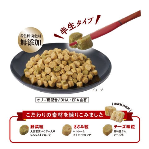 原材料 穀類(小麦粉、小麦グルテン)、肉類(鶏肉、鶏ささみ)、豆類(脱脂大豆)、糖類(砂糖、オリゴ糖)、油脂類(動物性油脂、フィッシュオイル:DHA・EPA源、アマニ油)、乳類(チーズ風味ペースト)、野菜類(にんじんパウダー、大麦若葉パウダー)、ビール酵母、プロピレングリコール、グリセリン、リン酸塩(Na)、セレン酵母、ビタミン類(A、D3、E、B1、B2、パントテン酸、ナイアシン、B6、葉酸、B12、コリン、イノシトール)、ミネラル類(カルシウム、リン、ナトリウム、塩素、鉄、銅、亜鉛、ヨウ素)、保存料(ソルビン酸カリウム)、酸化防止剤(ビタミンC)、膨張剤