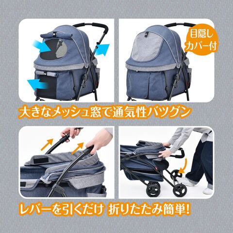 ●みんなで一緒にお出かけ!最大4頭まで乗れる犬用カートです。 ●6kg以下の小型犬最大4頭(耐荷重:25kg)まで対応です。 ●中型犬もゆったり乗れる広々バスケット、さらに収納バスケット、背面ポケット付きで荷物を入れられて手元スッキリ。 ●目隠しカバー付きなので人通りの多い時や寝てる時の目隠しも。 ●バスケットには4頭まで対応できる飛び出し防止リード4本付き。 ●前からも後ろからも開く両対面式カバー。カートを押しながら愛犬の様子を確認できる。 ●前後3か所のメッシュ窓で風が通り抜ける。通気性も抜群。 ●大容量バスケットで大きな荷物も出し入れしやすい。 ●後輪ロック付で、停止時でも安心。 ●前輪のキャスター回転止めで、坂道走行時のふらつき防止。 ●レバーを引くだけで、スリムに、簡単に折りたためるので収納にも便利。 |
