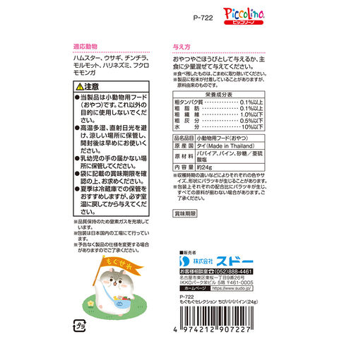| ご注意 | ※本品は小動物用のおやつです。目的以外の用途では使用しないでください。 |