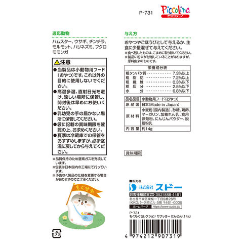 | ご注意 | ※本品は小動物用のおやつです。目的以外の用途では使用しないでください。 |
