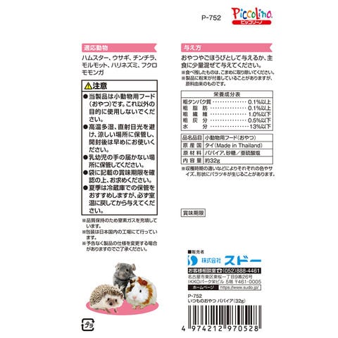 | ご注意 | ※本品は小動物用のおやつです。目的以外の用途では使用しないでください。 |