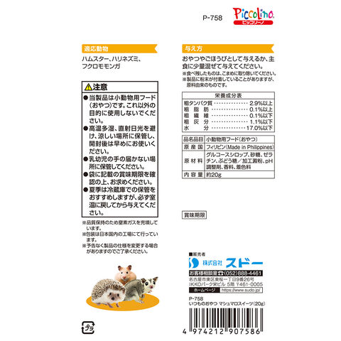 スドー いつものおやつ マシュマロスイーツ 20g ハムスター おやつ 小動物 小動物用品 餌 えさ エサ 飼料 フード おやつ オヤツ ご褒美 ご褒美 しつけ ハリネズミ フクロモモンガ 小粒 小さめ 小さい 小袋 4974212907586 kak 20260310 y26m03 ましゅまろ マシュマロ チップ チップス スナック