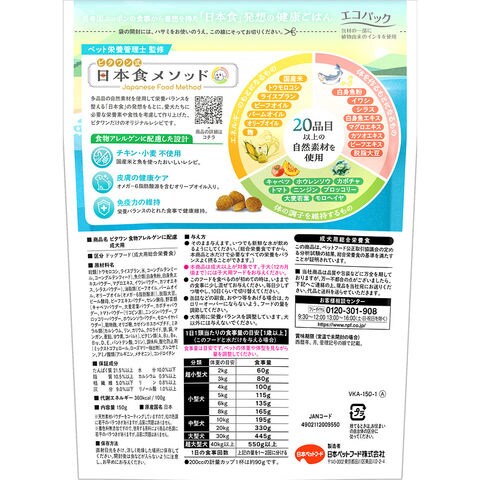 | 特長 | ●自然素材20品目が摂れるバランス総合栄養食で、長寿国ニッポンの食事に学ぶ、「日本食」を発想とした健康ごはんになります。 ●ペット栄養管理士監修のレシピで、「3色食品群」に基づいた栄養バランスで設計しています。 ●おなかの健康に、ライスブランや発酵食品の「麹」を使用し、様々な自然素材をバランスよく食べることで腸内細菌たちが元気に過ごせるようになり、愛犬の健康をサポートします。 ●白身魚やイワシなど、様々な魚の風味を組み合わせたおいしいレシピで、着色料・香料は無添加の国産ドッグフードになります。 ●皮膚の健康ケアに、オメガ-6脂肪酸源を含むオリーブオイル入りです。 ●チキン・小麦は不使用で、食物アレルゲンに配慮しています。 ●室内犬に合ったヘルシー設計です。 ●トイプードルやチワワなど、小型犬でも食べやすい「小粒タイプ」になります。 |