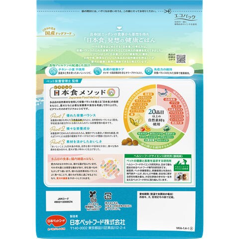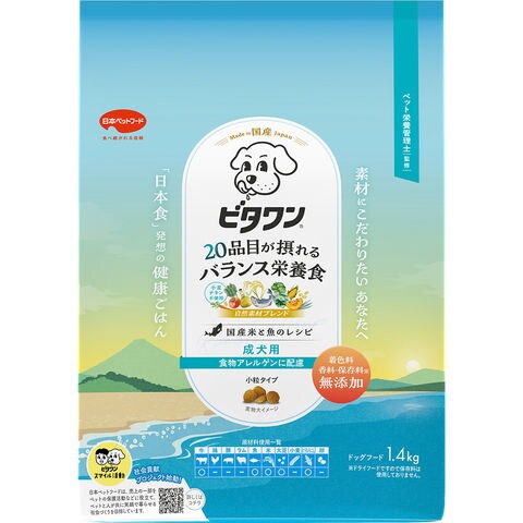 メーカー画像 日本ペットフード ビタワン 食物アレルゲンに配慮 成犬用 1.4kg 4902112009574 20260317 y26m03 cngc 犬 イヌ いぬ dog DOG えさ 餌 エサ ごはん 犬用 犬用品 dogfood ドッグフード ドックフード ドライフード 総合栄養食 国産 日本産 日本 日本食 自然素材 成犬 小粒 着色料不使用 香料不使用 保存料不使用 食物アレルゲン 低アレルゲン アレルゲン 魚 さかな サカナ 白身魚 イワシ いわし ペット栄養管理士 免疫力維持 ヘルシー お腹 お腹の健康 腸内細菌 腸内 ライスブラン 発酵食品 麹 野菜 栄養バランス 健康サポート 3色食品 室内犬 小型犬 トイプードル チワワ 皮膚の健康 皮膚 オメガ-6脂肪酸源 オリーブオイル チキン不使用 小麦不使用 リコピン