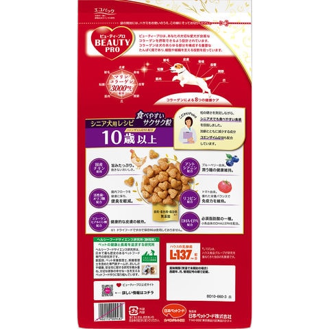 メーカー画像 日本ペットフード ビューティープロ ドッグ 10歳以上 660g(小分け4袋) 4902112009482 20260324 y26m03 cngc 犬 イヌ いぬ dog DOG えさ 餌 エサ ごはん 犬用 犬用品 dogfood ドッグフード ドックフード ドライフード 総合栄養食 獣医師監修 ビューティー BEAUTYPRO 乳酸菌 毛並み 関節 皮膚 被毛 コラーゲン ヒアルロン酸 ハウス乳酸菌L-137 自然免疫ケア グルコサミン コンドロイチン たんぱく質 タンパク質 DHA EPA 必須脂肪酸 リコピン 免疫力 オリゴ糖 腸内フローラ 腸 便臭 便臭軽減 着色料無添加 香料無添加 カリカリ サクサク 小粒 チキン 小分け 栄養バランス ブルーベリー アントシアニン 瞳 目 国産 日本産 日本 飽きない シニア シニア犬 高齢犬 老犬 食べやすい コエンザイムQ10
